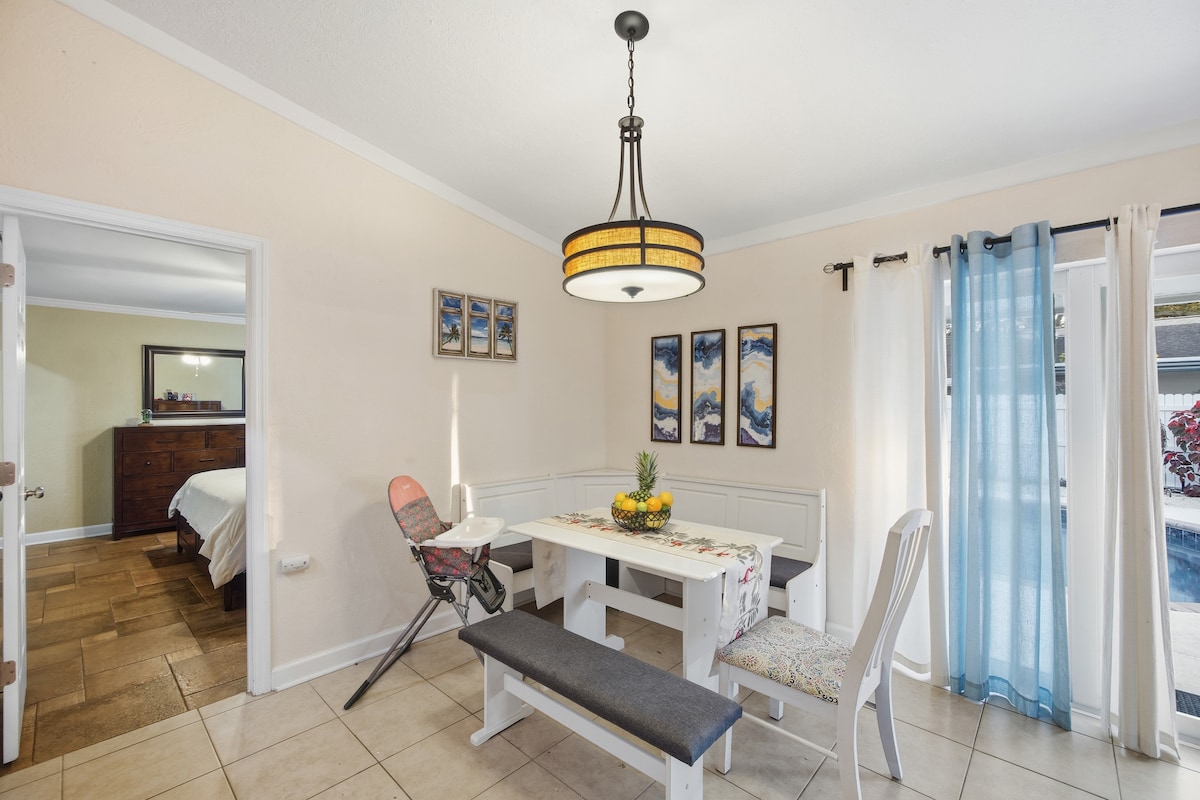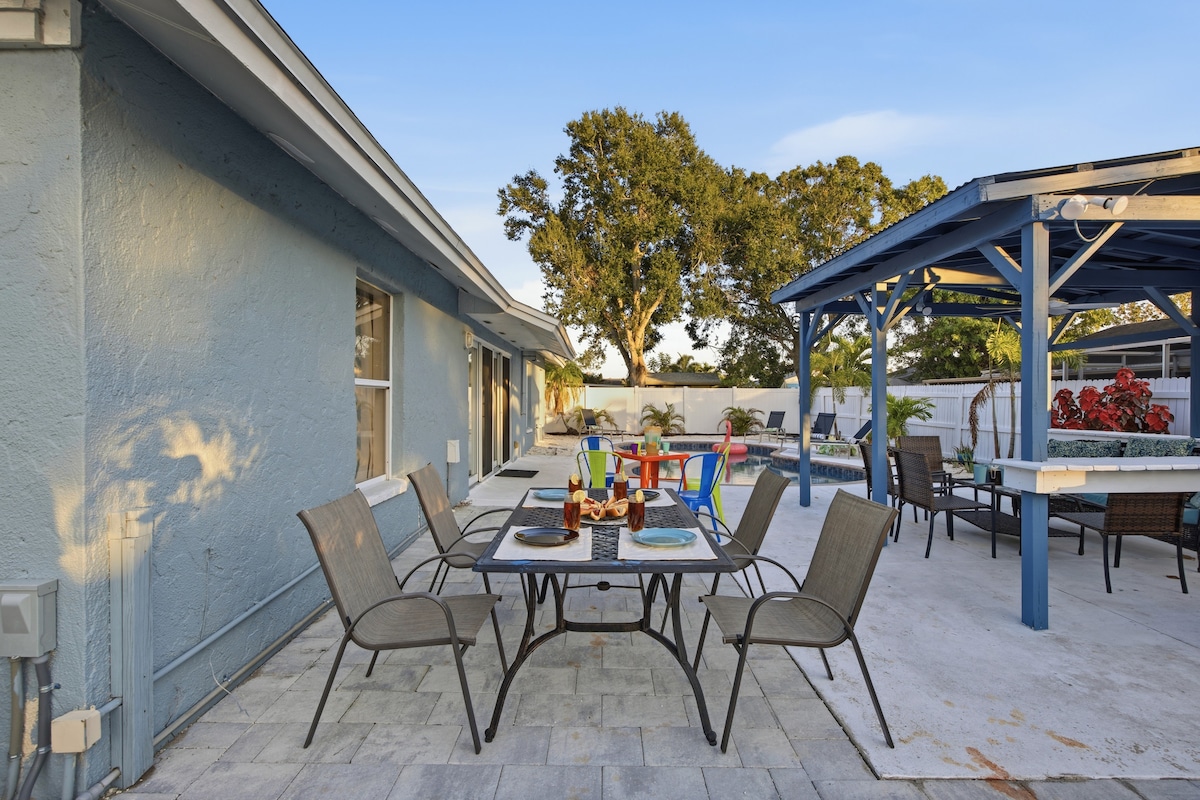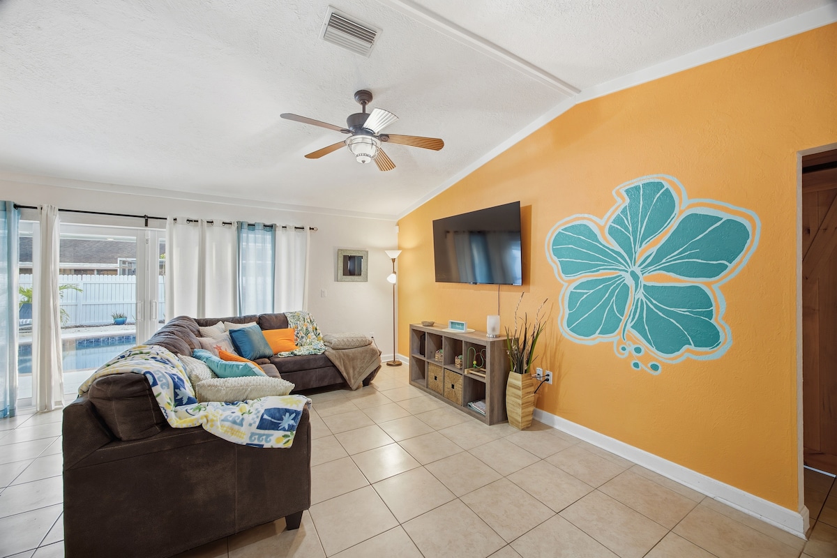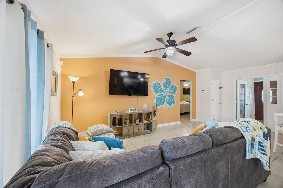 The living room offers ample seating with a bright, open layout and a large 65" smart TV—perfect for unwinding with your favorite shows or hosting family movie nights. Board games are available for those who prefer off-screen entertainment. For more relaxation, step outside to the covered patio where comfortable outdoor seating invites you to enjoy morning coffee or an evening drink by the pool