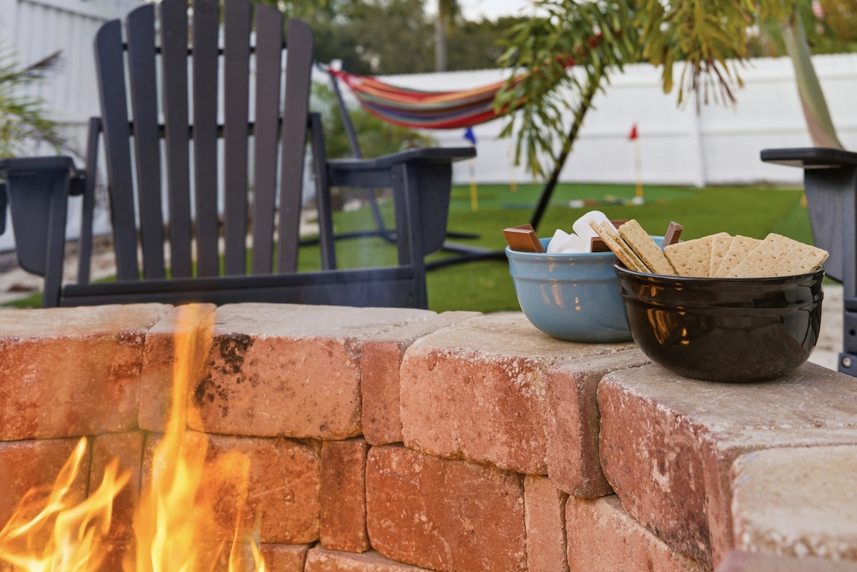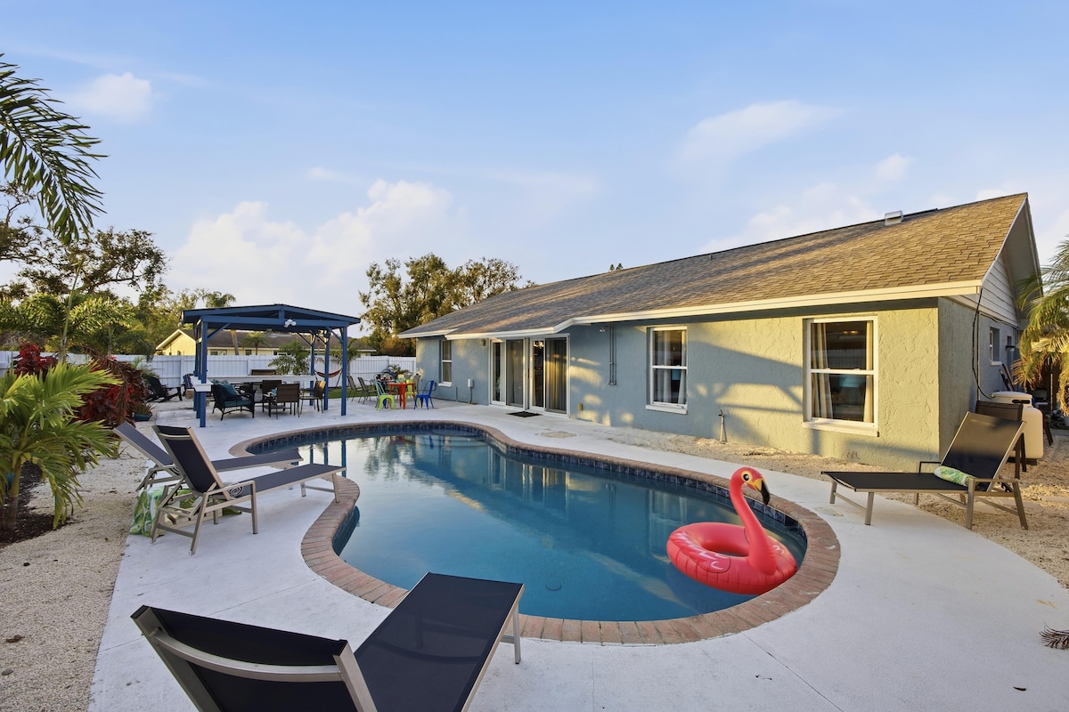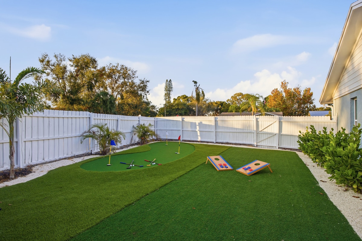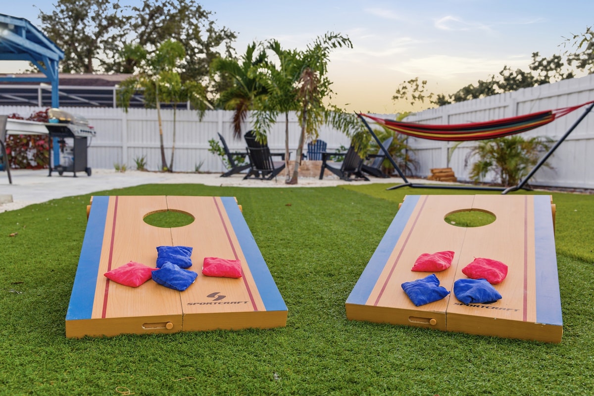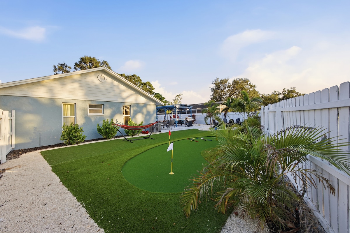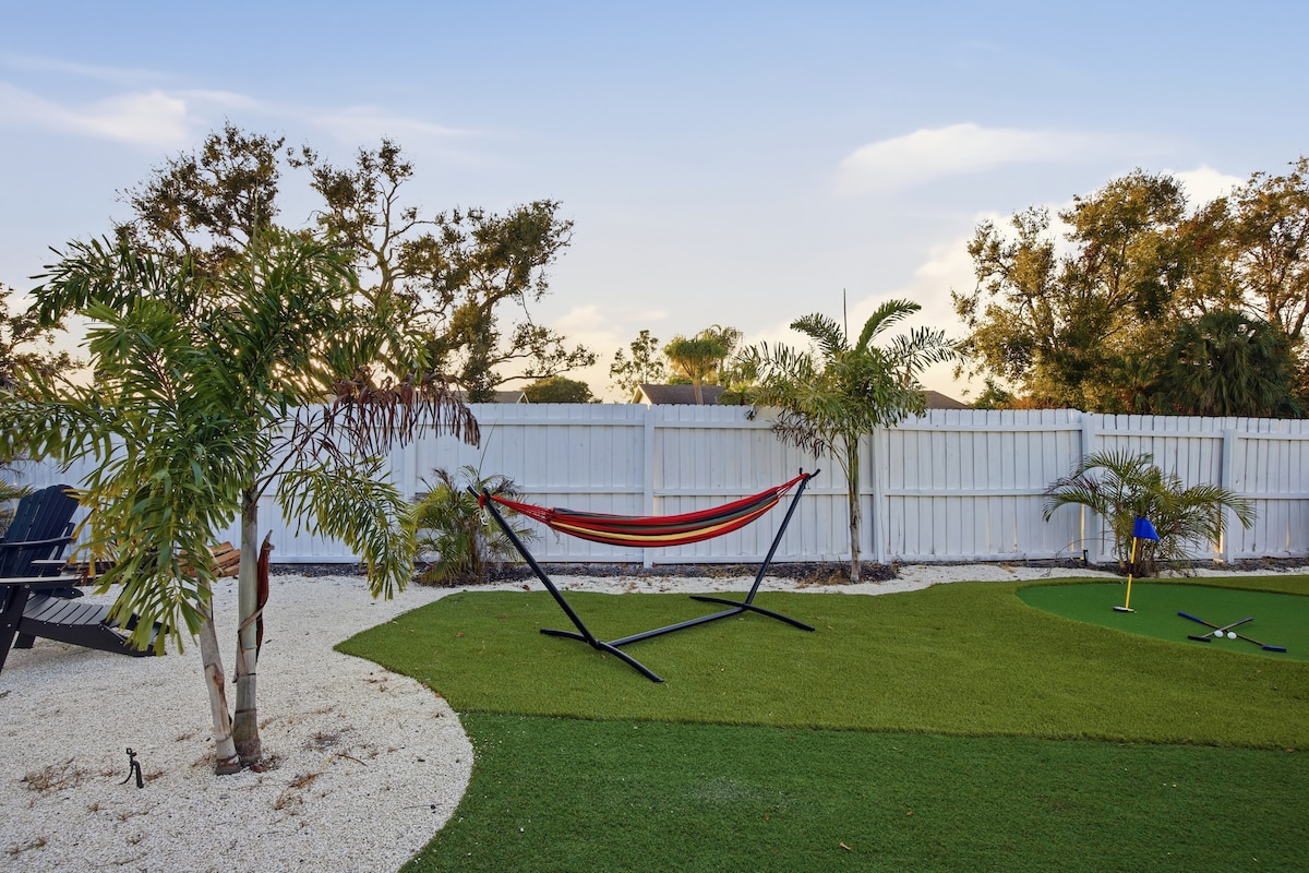 Step into your private Florida getaway! The backyard features a resort-style swimming pool, surrounded by lounge chairs for sunbathing. Enjoy the shaded covered patio, perfect for outdoor dining or relaxing under the fan. The backyard also includes a fire pit area, a mini putting green, cornhole, a hammock, and spacious seating areas for gathering, playing, or simply soaking in the sunshine. Whether you're swimming, grilling, gaming, or relaxing, this outdoor oasis is designed for fun and unforgettable memories.
