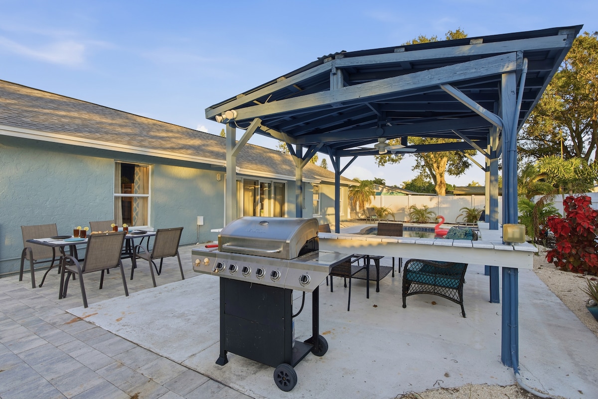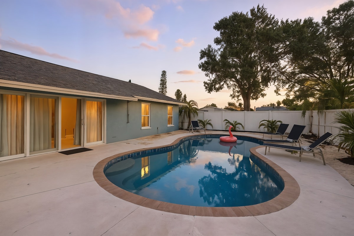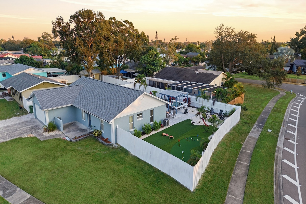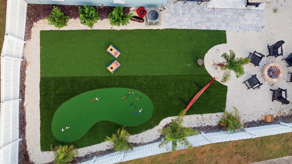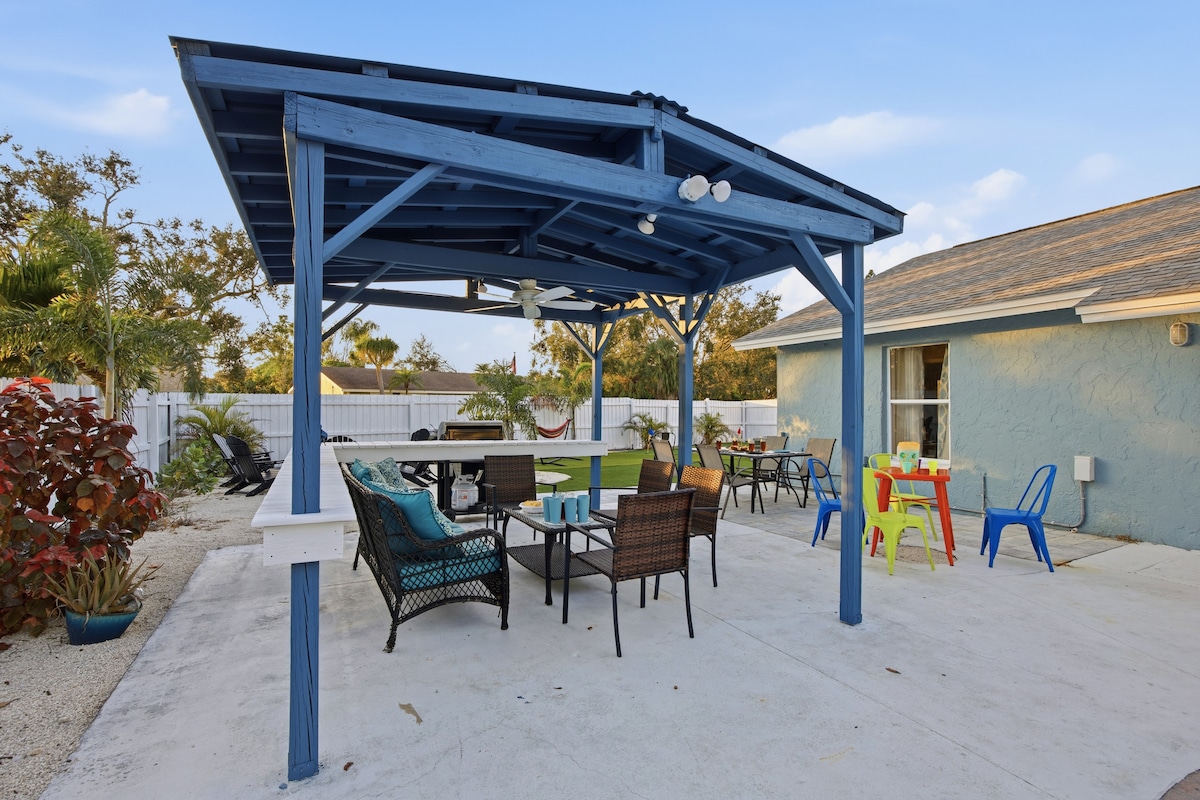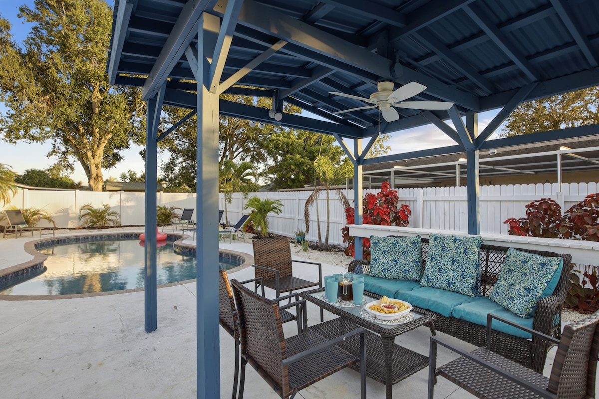 Step into your private Florida getaway! The backyard features a resort-style swimming pool, surrounded by lounge chairs for sunbathing. Enjoy the shaded covered patio, perfect for outdoor dining or relaxing under the fan. The backyard also includes a fire pit area, a mini putting green, cornhole, a hammock, and spacious seating areas for gathering, playing, or simply soaking in the sunshine. Whether you're swimming, grilling, gaming, or relaxing, this outdoor oasis is designed for fun and unforgettable memories.