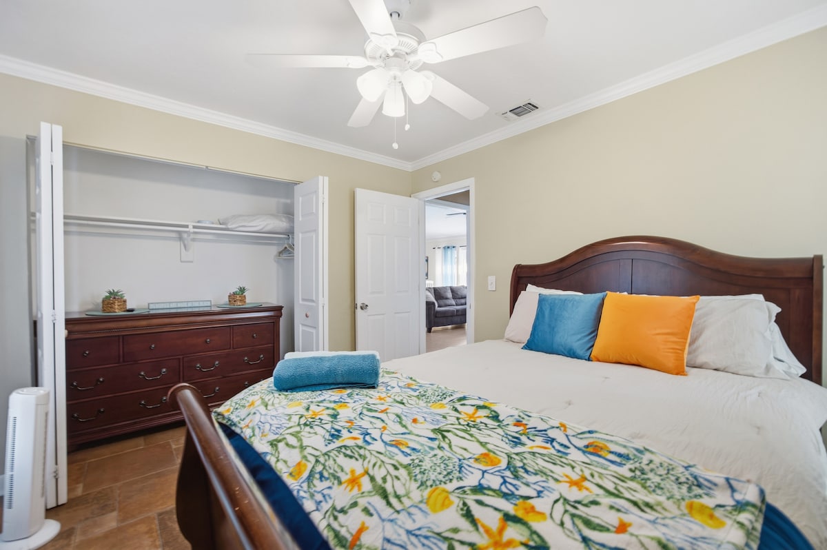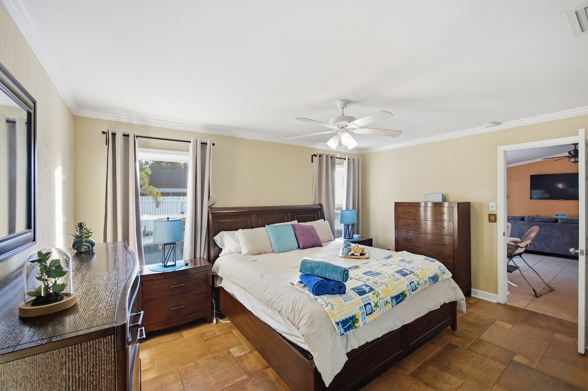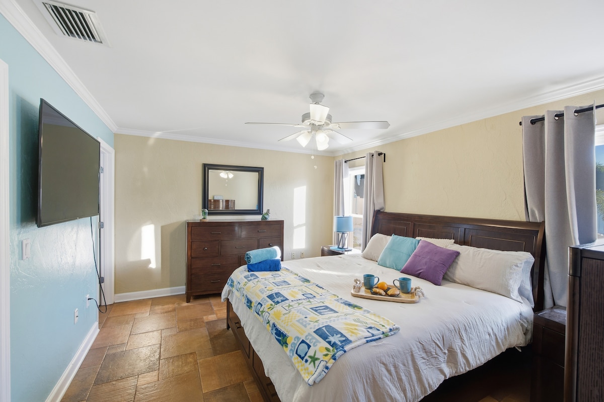 The primary bedroom features a spacious king-size bed, a 65" smart TV, and plenty of dresser and closet space—creating a peaceful retreat after a day at the beach.