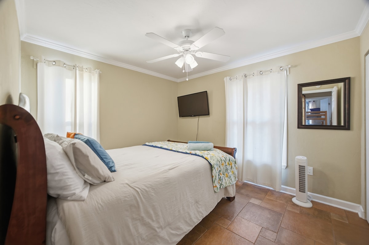 The first guest bedroom offers a cozy queen bed with natural light and storage space, perfect for couples or solo travelers.
