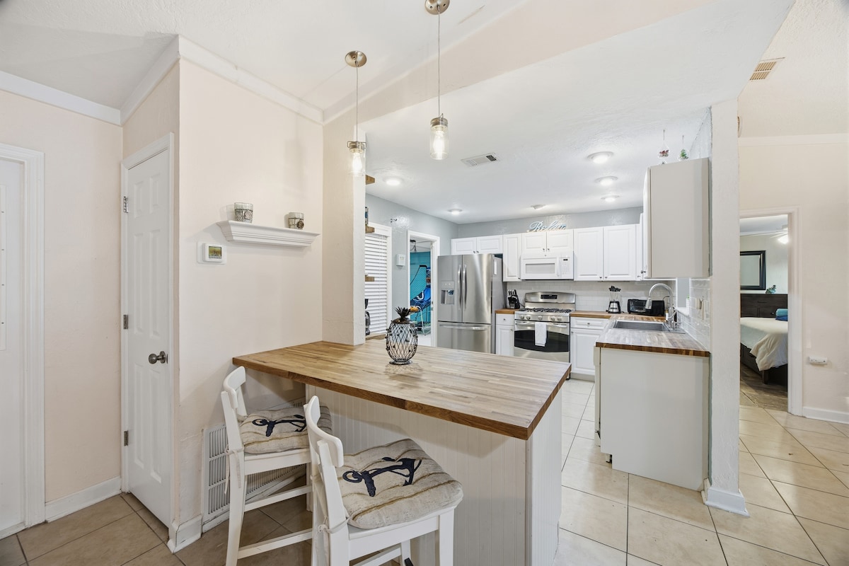 The fully stocked kitchen includes all the cookware, dishware, silverware, and essentials you'll need to prepare meals with ease. Whether you’re whipping up breakfast before the beach or enjoying a family dinner, the open-concept design keeps everyone connected. The dining area offers comfortable seating for your group and flows naturally into the living room, making shared meals and conversation effortless.