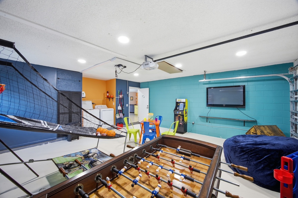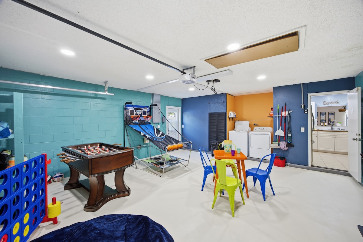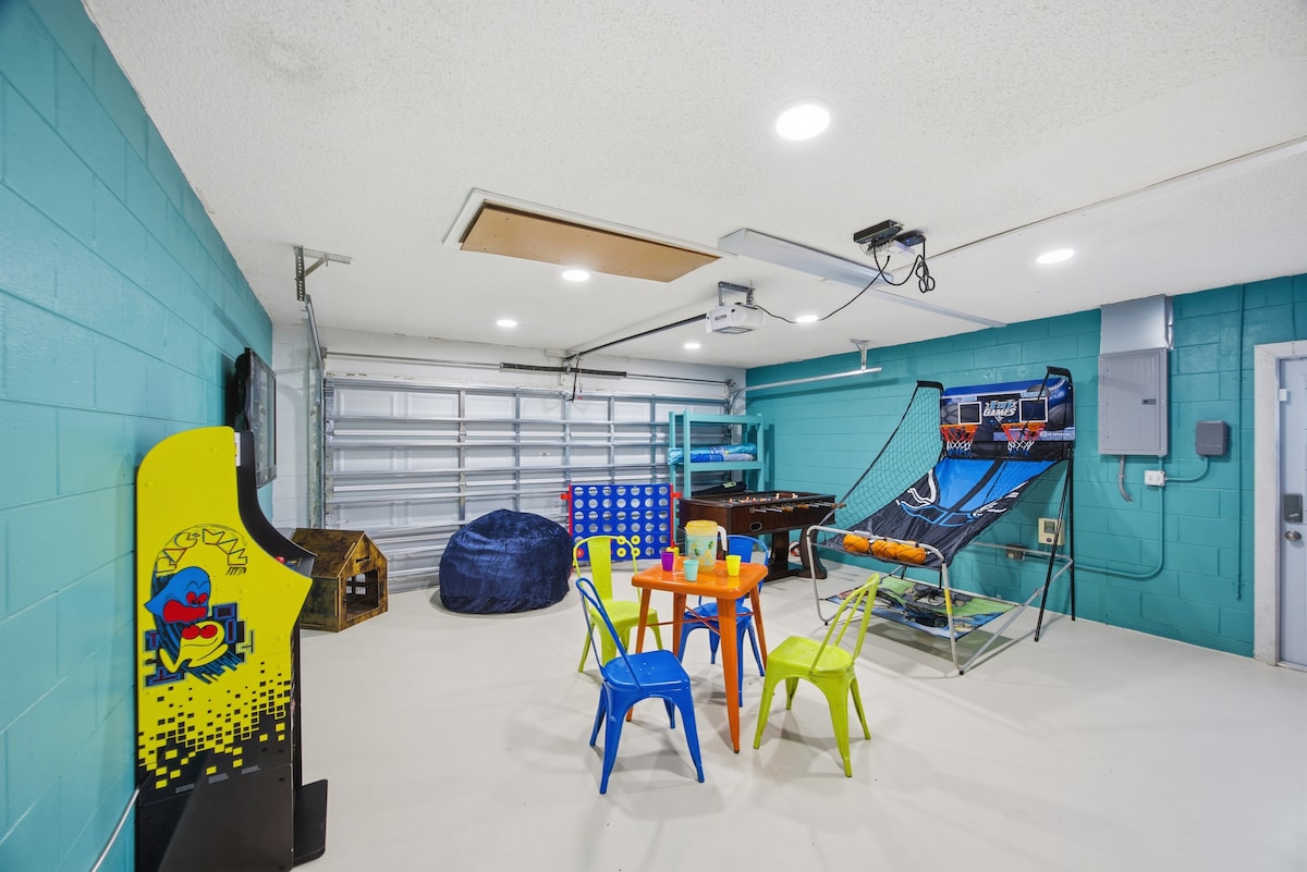 The garage has been transformed into a fun-filled game room for all ages. Guests can enjoy: