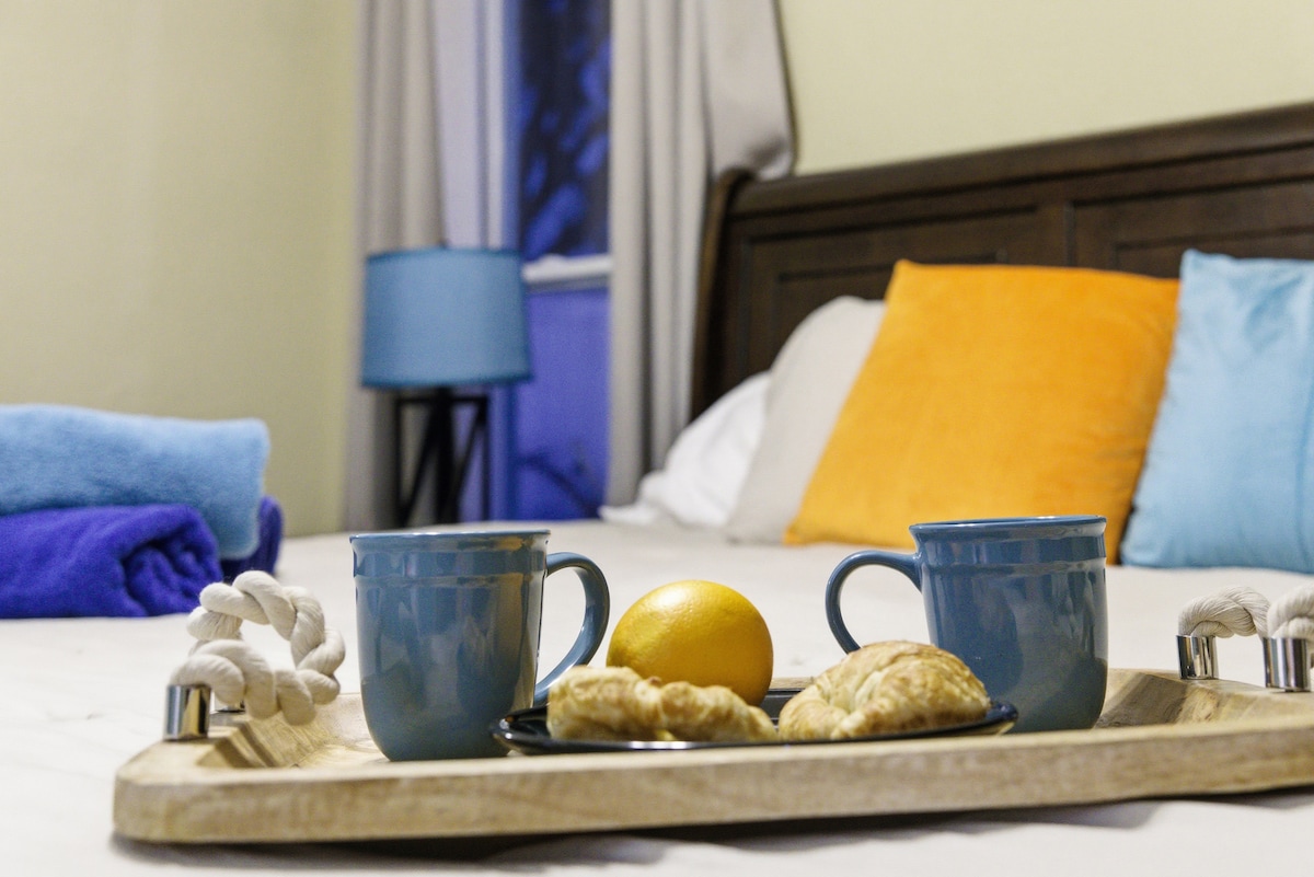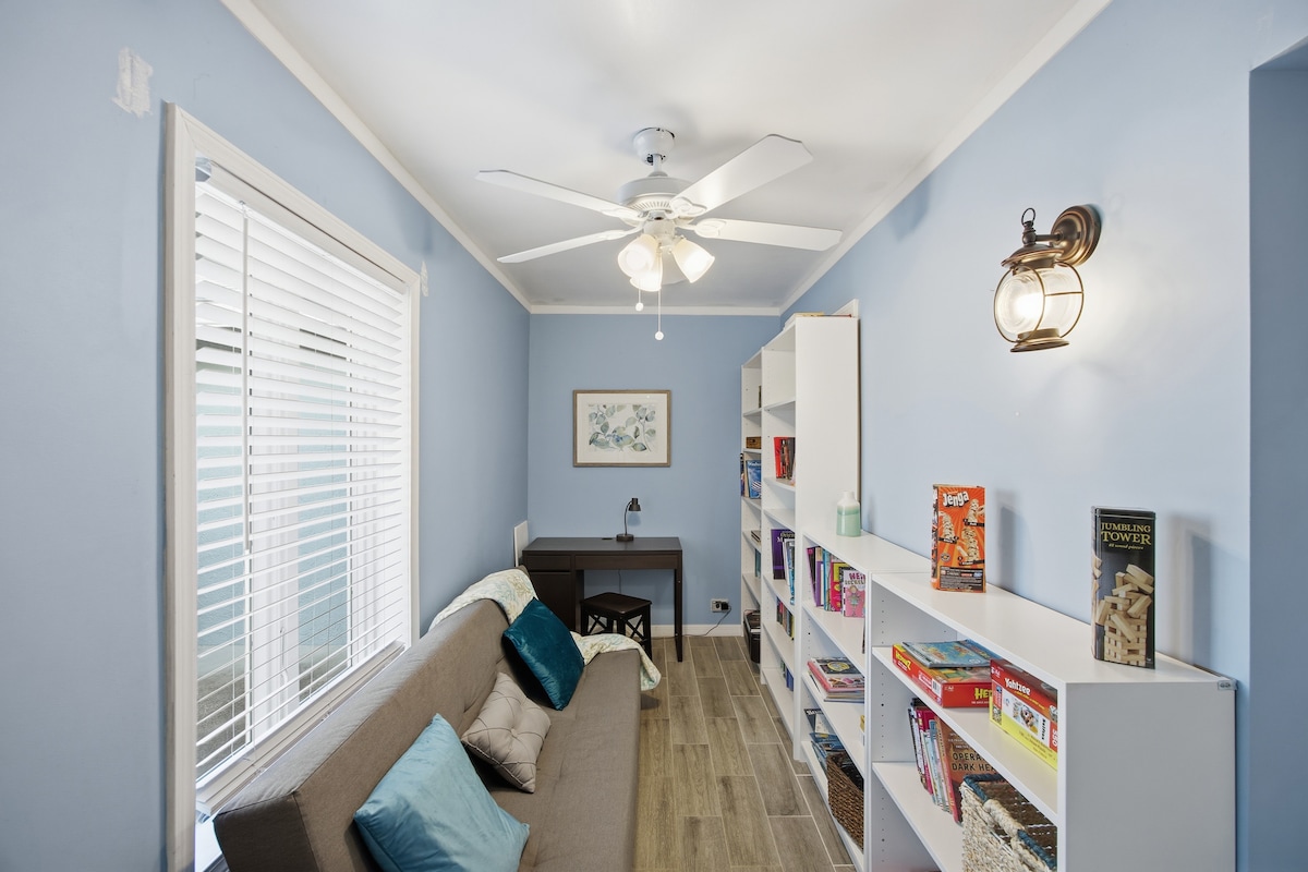 This fourth guest room offers a futon for flexible sleeping arrangements and a convenient desk-and-chair setup ideal for working during your stay.